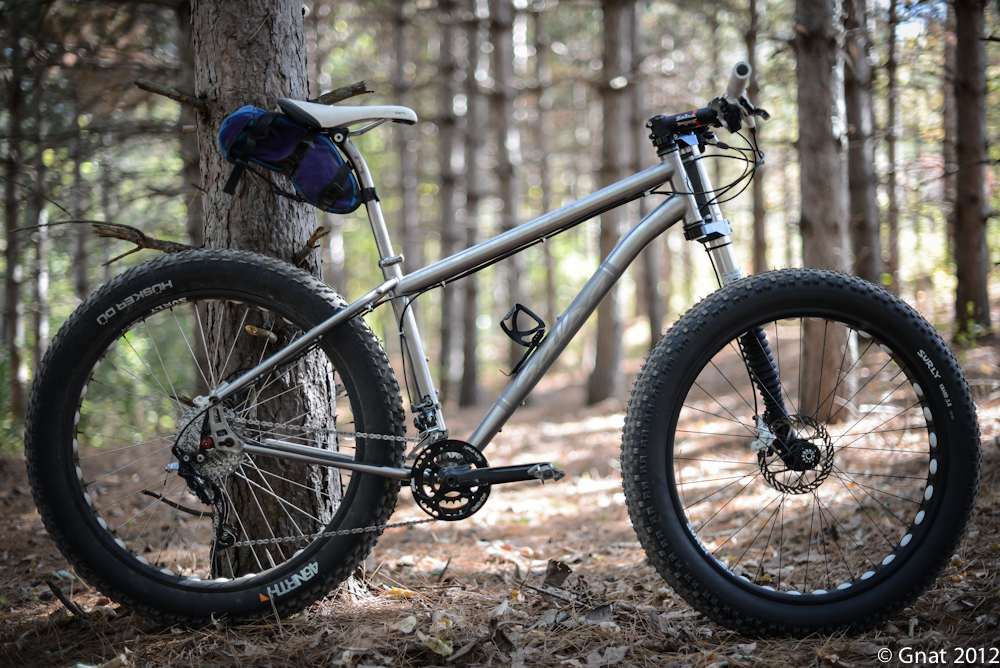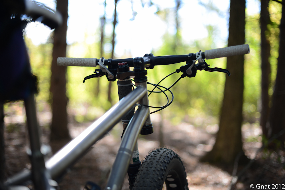 Some will also likely ask why I did not mount this on a new Salsa Beargrease frame as it would be even lighter as a full on fatXC bike? Well…Two reason. I like titanium. It is just so sweet looking, durable and it rides just right. Also, I plan to try some 29+ wheels and tires in this rig once they are available. With the Mukluks sporting Alternator drop outs slid backwards from the position shown above, they should fit. The geometry may not be optimized, but I am looking forward to trying it anyway.