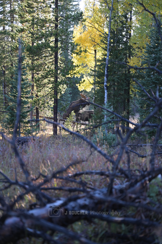 OK…Now onto the moose. A little backstory first. Jen has always wanted to see a moose in the wild. We have been to so many places in our lives where folks we were with or folks we meet on our trips saw a moose. We drove up to Rabbit Ears to look at the fall colors and were driving along an old, abandoned highway. I spotted two and was so excited to see two moose along the side of the road. Our windows were down and I yelled “MOOSE!” so loudly I startled them. Thankfully they simply started wandering into the woods parallel to another road and we followed from a distance. The two moose stopped in this incredibly beautiful and scenic little valley. I took some pics but quickly stopped once I found out what I was photographing. This may go down as my most popular and controversial wildlife photo ever!