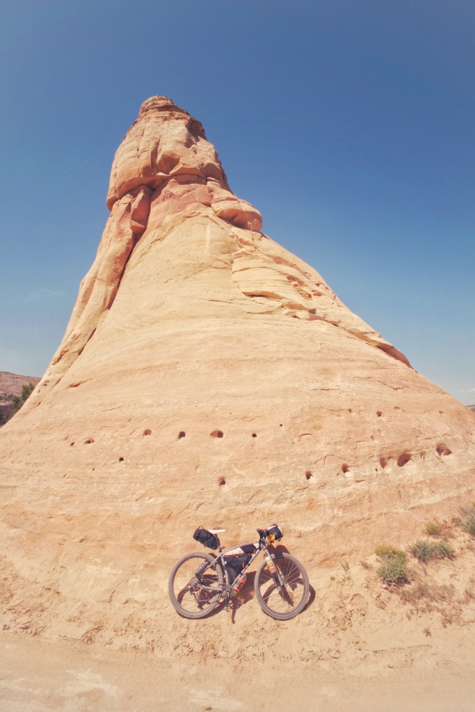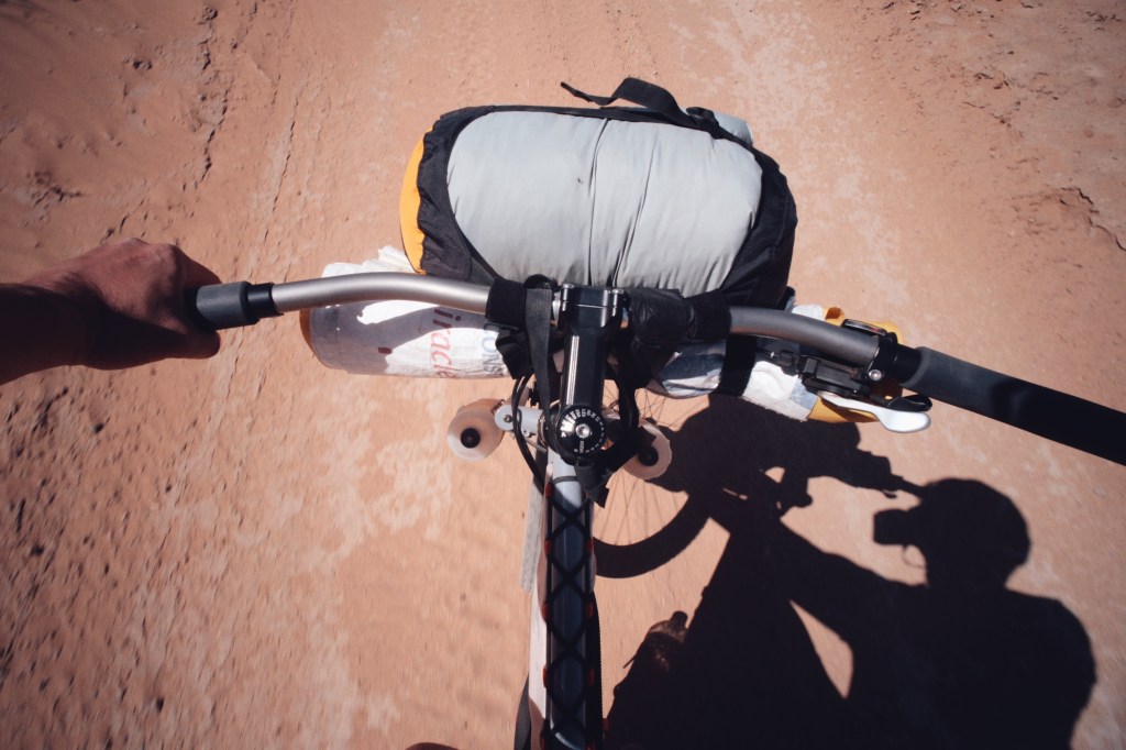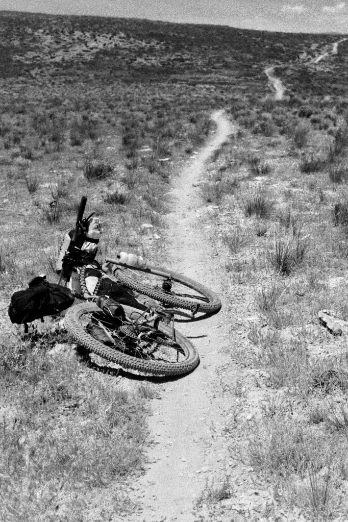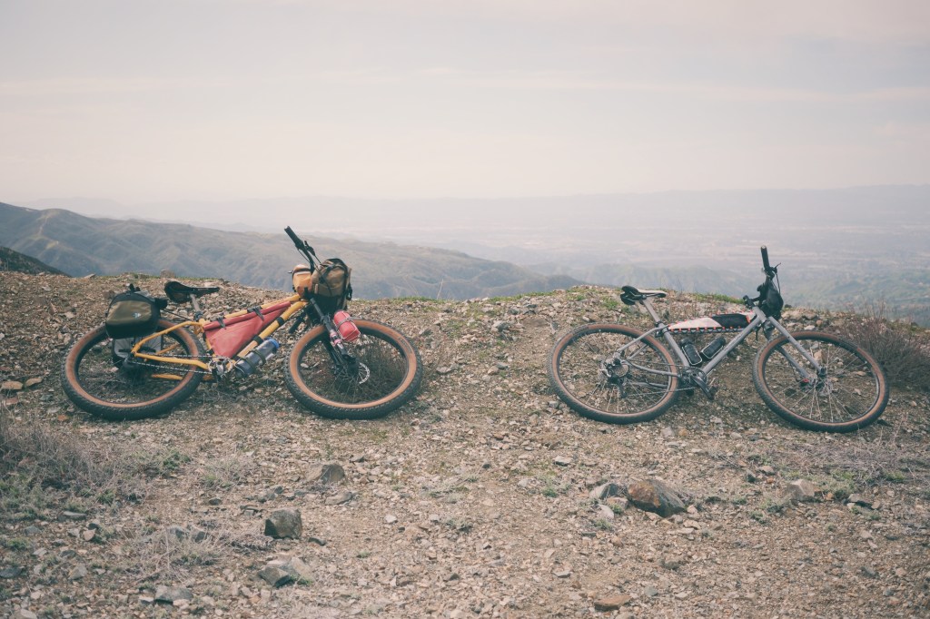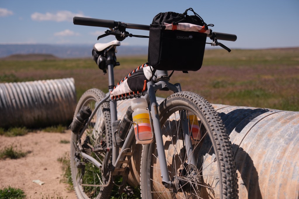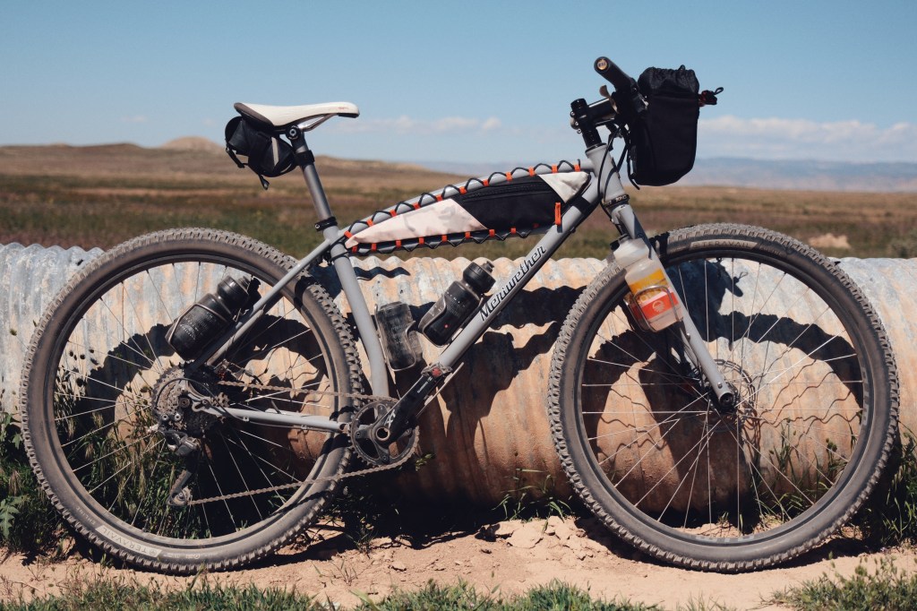 These two images reflect how you will see this bike set up and used for a majority of its life. The left shows full bike packing capability and the right shows my dirt road exploration version without framebag and with custom, bar mounted camera bag.